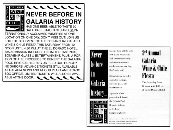 The ad on the left is a disaster — text is in all capitals with no logical grouping. The ad on the right not only incorporates the principle of