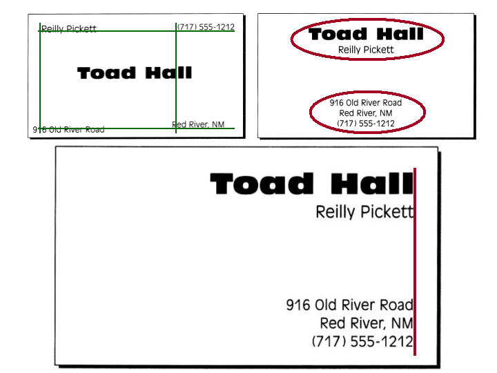 | In the first example above, the green lines show that nothing lines up with anything in the business card. In the next example, the grouping is a big improvement, but we still have boring centered alignment. The final example utilizing right alignment shows that even when elements are separated, they look as if they belong together as long as they are lined up. | |