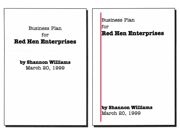 | The report cover on the left may look typical, but there is much room for improvement. By switching the alignment from boring centering to left alignment in the example on the right, it is now actually set apart from all the other documents made by people who automatically center everything. Also, in the process of achieving optimum proximity, if you are going to separate groups of text for some reason, then really separate them. But again, because the groups are lined up with each other, the eye supplies the red line in the example and the result is a more organized and professional look. | |