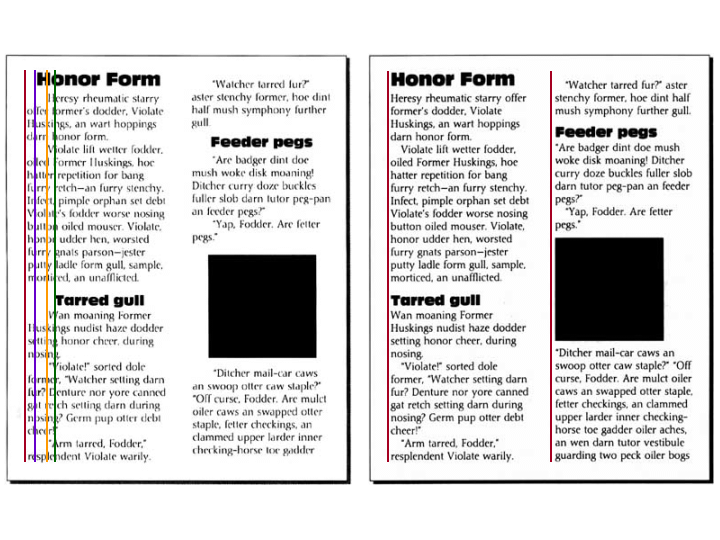 consistency of alignment. The red line indicates the far left edge of the text blocks. The blue line shows that the nonsense headline "Honor Form" doesn't line up with anything. The yellow line is where each paragraph starts after indenting, and the green line shows that the second headline, "Tarred gull," also doesn't line up with anything. In fact, everything is so not lined up. The example on the right shows how much more professional and organized it looks to