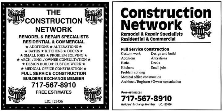 There are major problems with the ad on the left. All capitals, no grouping, all centered, too many eagles, and an overkill border